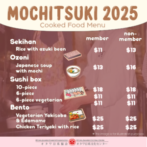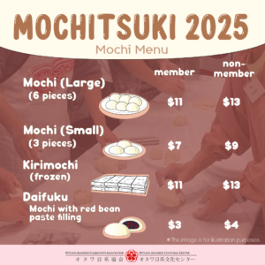 If you would like to purchase mochi in advance, pickup will be on November 29th, between 1:00 p.m. and 3:00 p.m.
